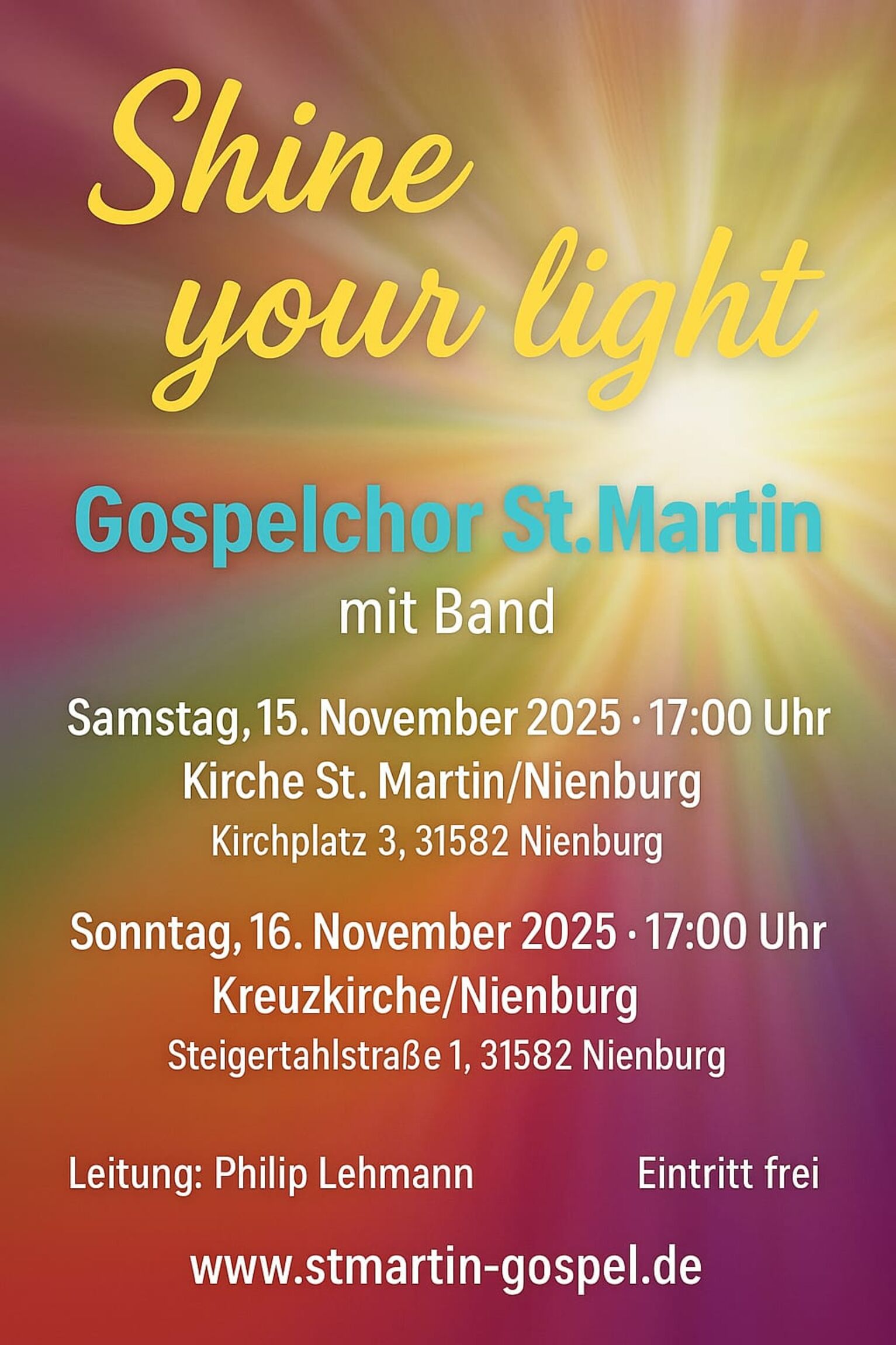Der Gospelchor St. Martin lädt herzlich zu zwei Konzerten im November ein. Unter der Leitung von Philip Lehmann präsentiert der Chor sein neues Programm „Shine your light“ – eine musikalische Reise durch traditionelle und moderne Gospels sowie Spirituals.