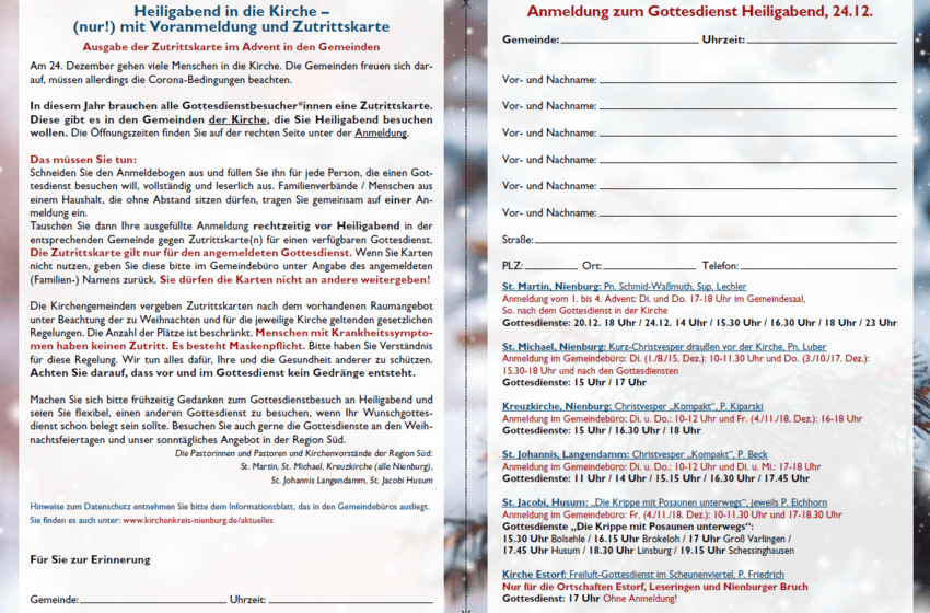 Die Kirchengemeinden in der Region Süd des Kirchenkreises Nienburg haben sich für ein gemeinsames Anmeldesystem für die Gottesdienste am Heilig Abend entschieden. Gottesdienstbesucher*innen müssen ...